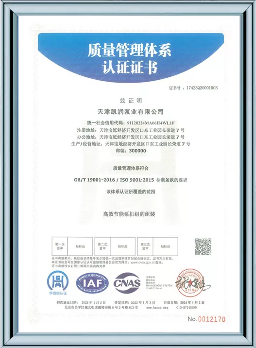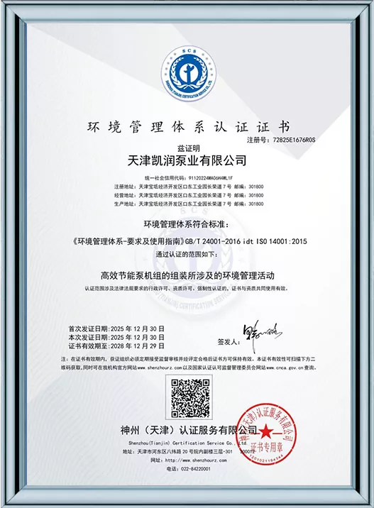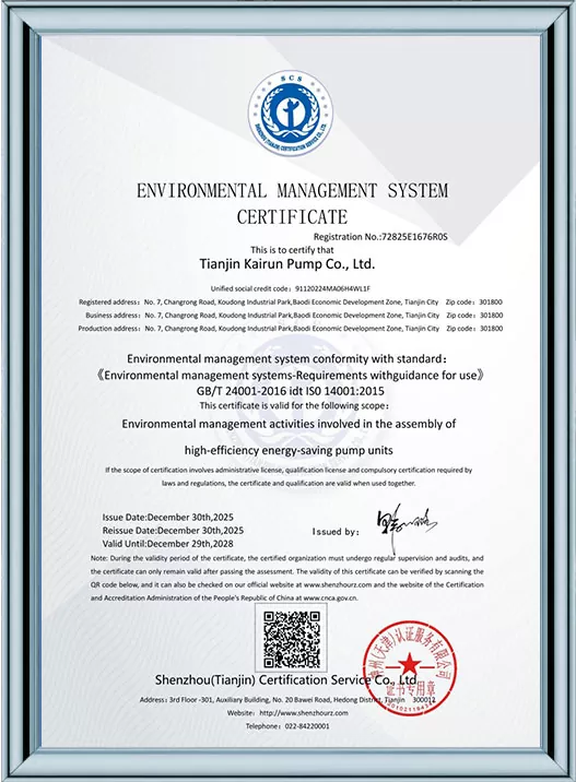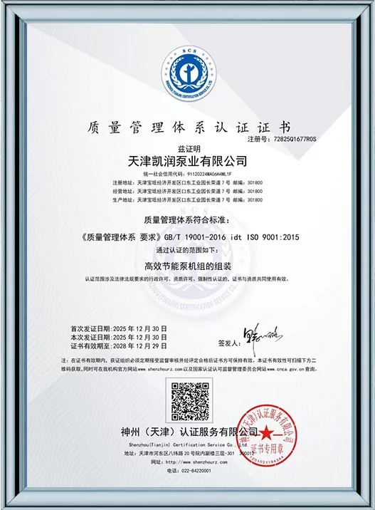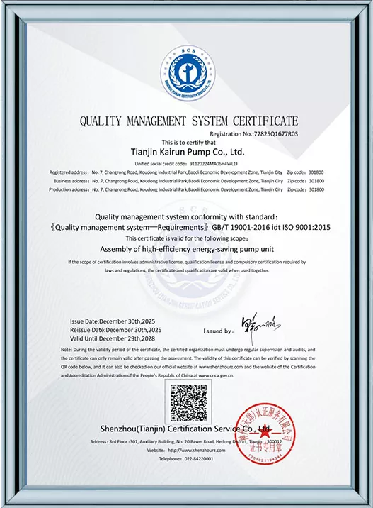 Tianjin Kairun Pump Industry Co., Ltd.는 중국 천진에 본사를 둔 고성능 워터 펌프 및 유체 운송 솔루션의 개발, 생산 및 판매를 전문으로 하는 신뢰할 수 있는 제조업체 및 공급업체입니다. 2018년 설립 이후 우리는 전 세계 산업계에 우수한 품질의 제품과 탁월한 서비스를 제공하기 위해 최선을 다해 왔습니다.